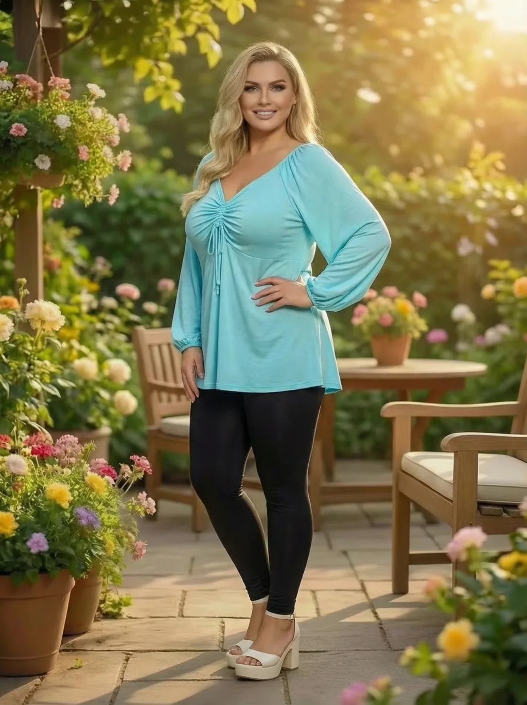 A mély V-kivágás és az elől megkötős részlet kiemeli a dekoltázst, miközben a bővebb ujjrész könnyed, lezser eleganciát kölcsönöz.