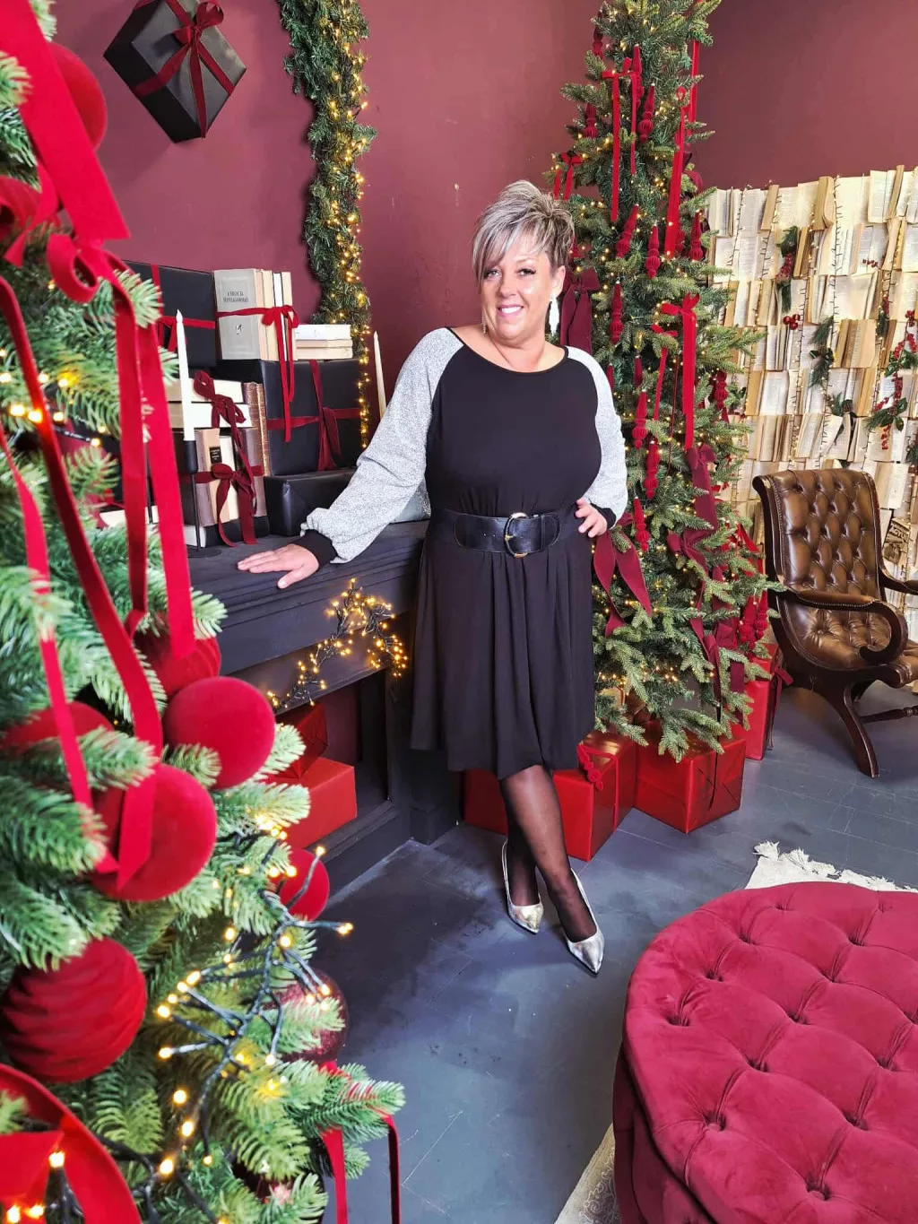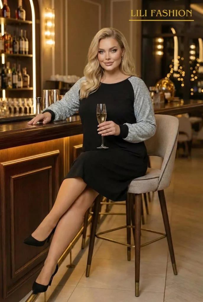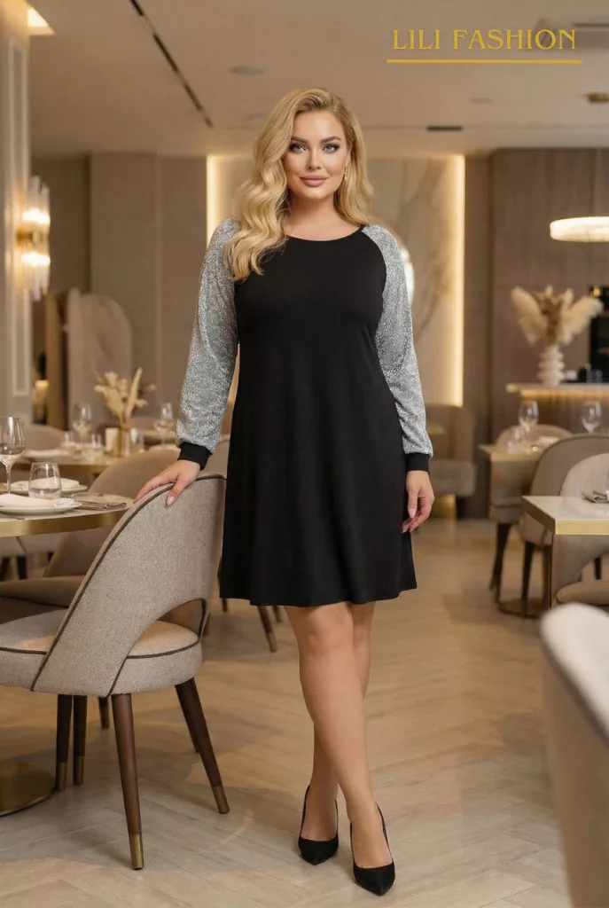 A klasszikus fekete alapszín optikailag karcsúsít, míg a csillogó ezüst ujjak ünnepi, mégis kifinomult hatást keltenek.