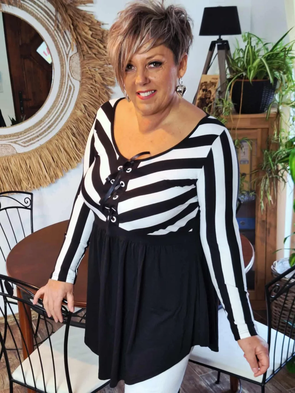 Ez a csíkos felsőrészű, bővülő szabású tunika nőies, mégis kényelmes darab, amely tökéletesen kiemeli a felsőtestet, miközben lazán elrejti a csípő- és hasrészt.