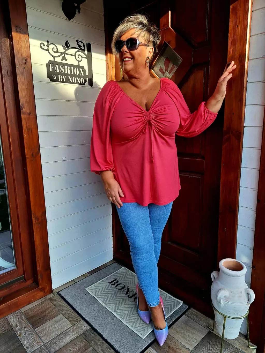 A mély V-kivágás és az elől megkötős részlet kiemeli a dekoltázst, miközben a bővebb ujjrész könnyed, lezser eleganciát kölcsönöz.