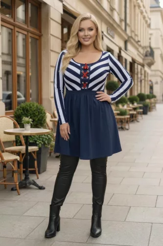 Ez a csíkos felsőrészű, bővülő szabású tunika nőies, mégis kényelmes darab, amely tökéletesen kiemeli a felsőtestet, miközben lazán elrejti a csípő- és hasrészt.