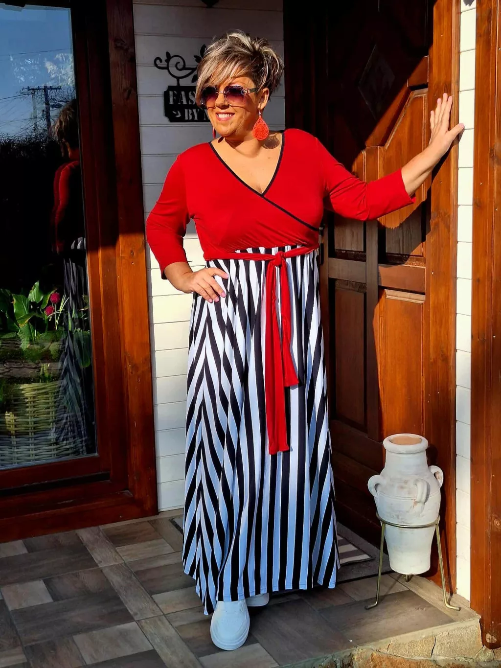Fashion by Nono Flowers maxiruha, piros fehér-sötétkék csíkos XL méretben