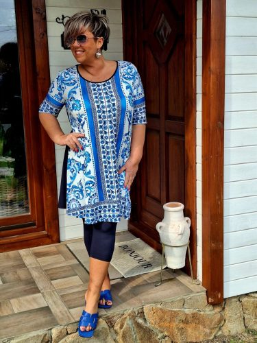 Fashion by Nono Olívia "A" vonalú ruha, kék-mintás 4XL méretben