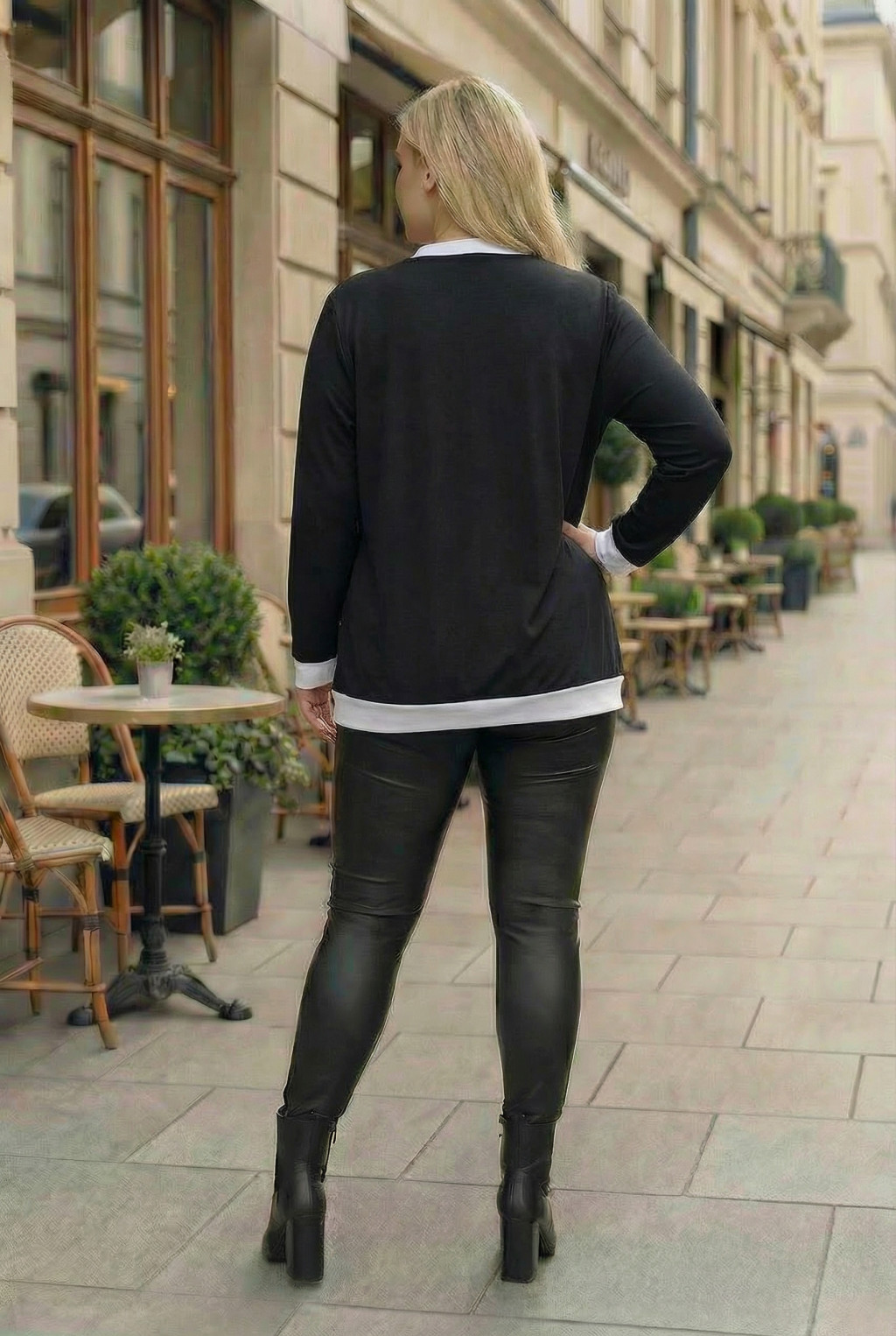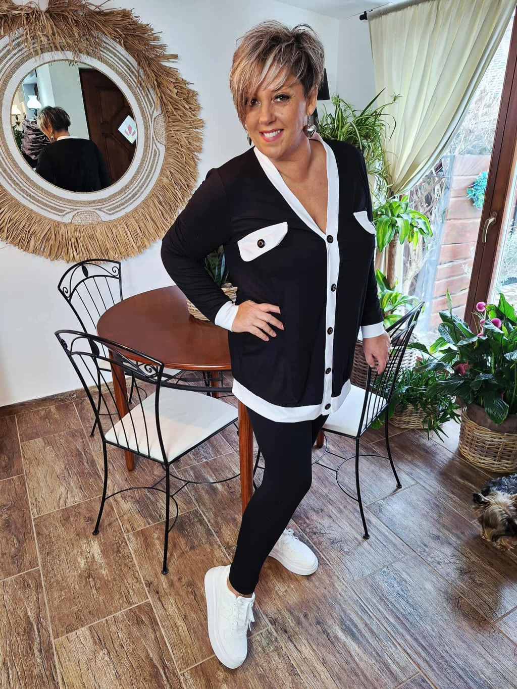 A fekete alapszínt a fehér kontrasztos szegélyek és zsebrészletek teszik különlegessé, miközben a fazon nőies, kényelmes és jól kombinálható a mindennapokban.