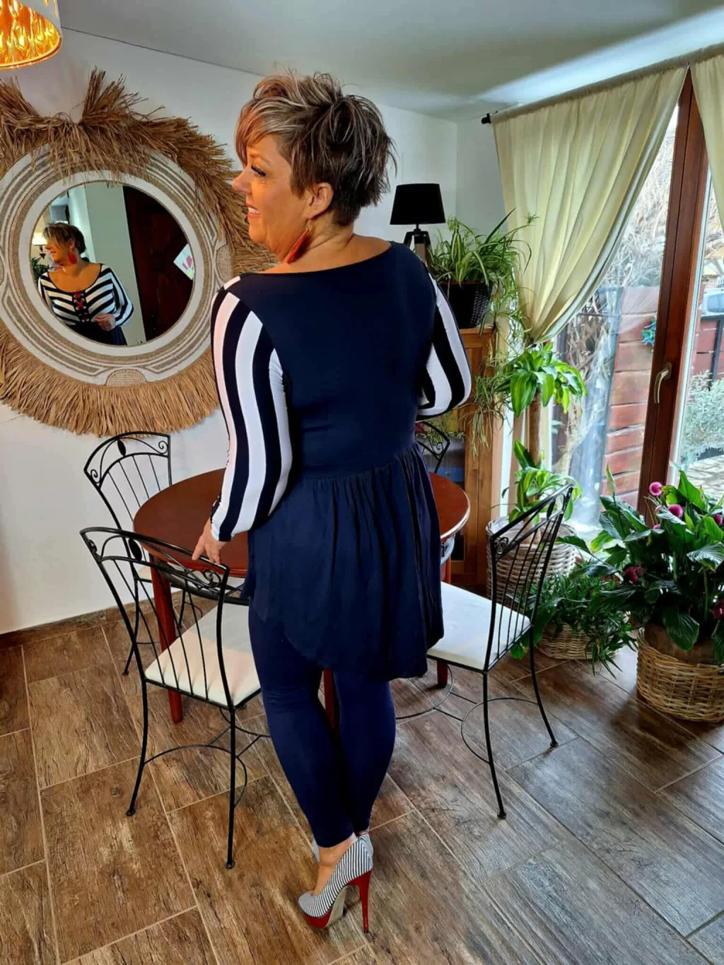 Ez a csíkos felsőrészű, bővülő szabású tunika nőies, mégis kényelmes darab, amely tökéletesen kiemeli a felsőtestet, miközben lazán elrejti a csípő- és hasrészt.