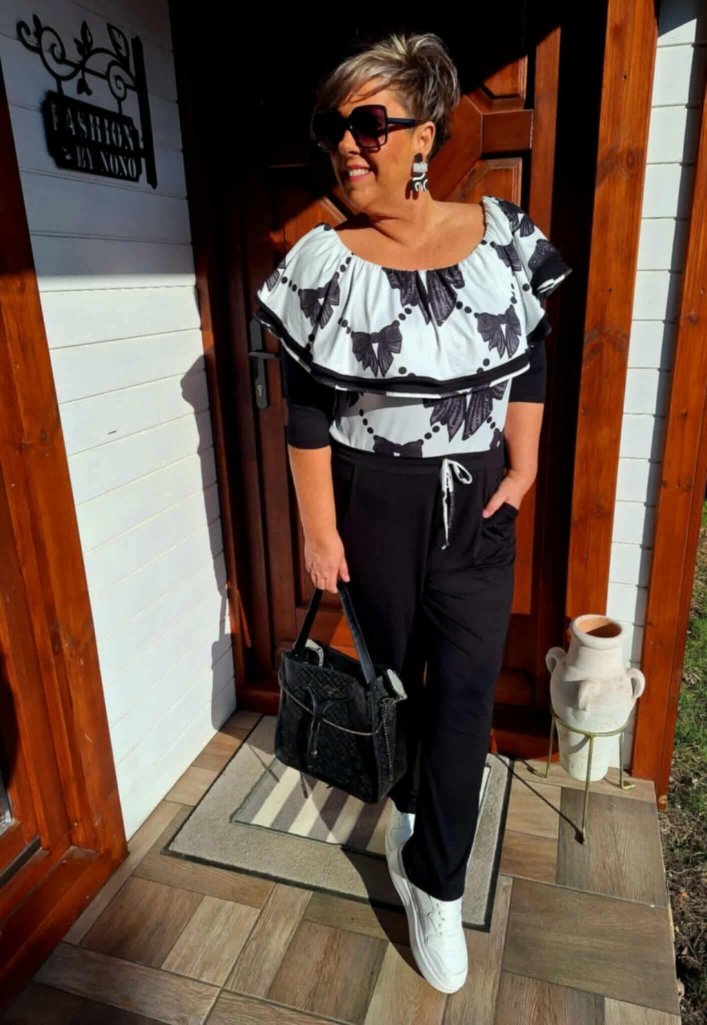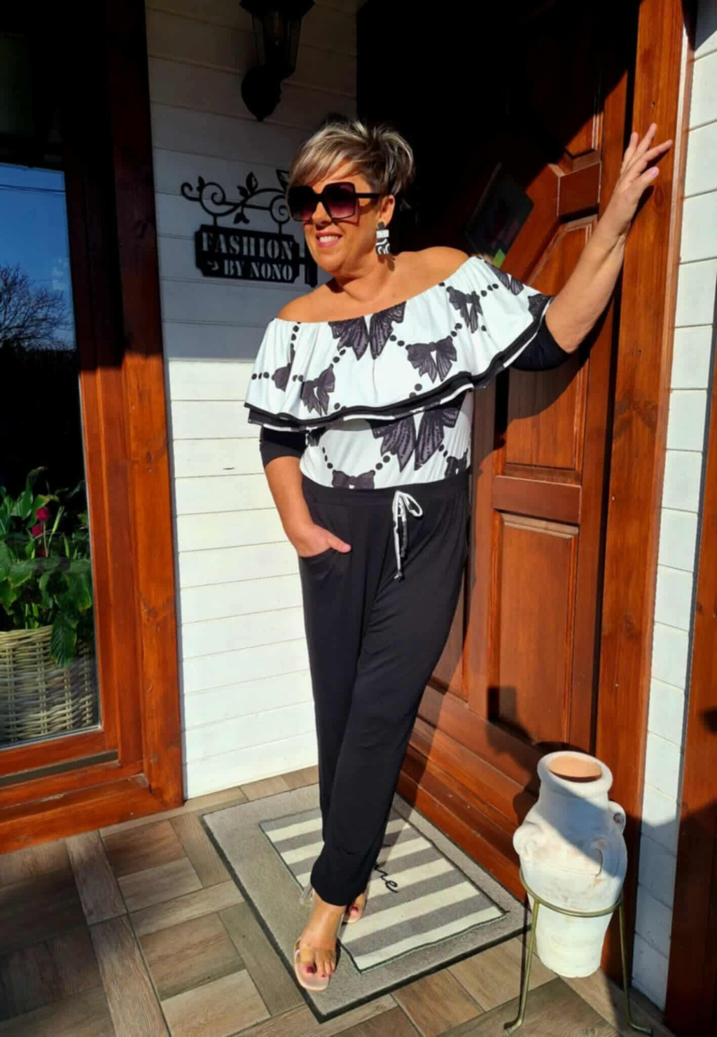 Fashion by Nono Szimeoni overál, fehér-fekete masni mintás 2XL méretben